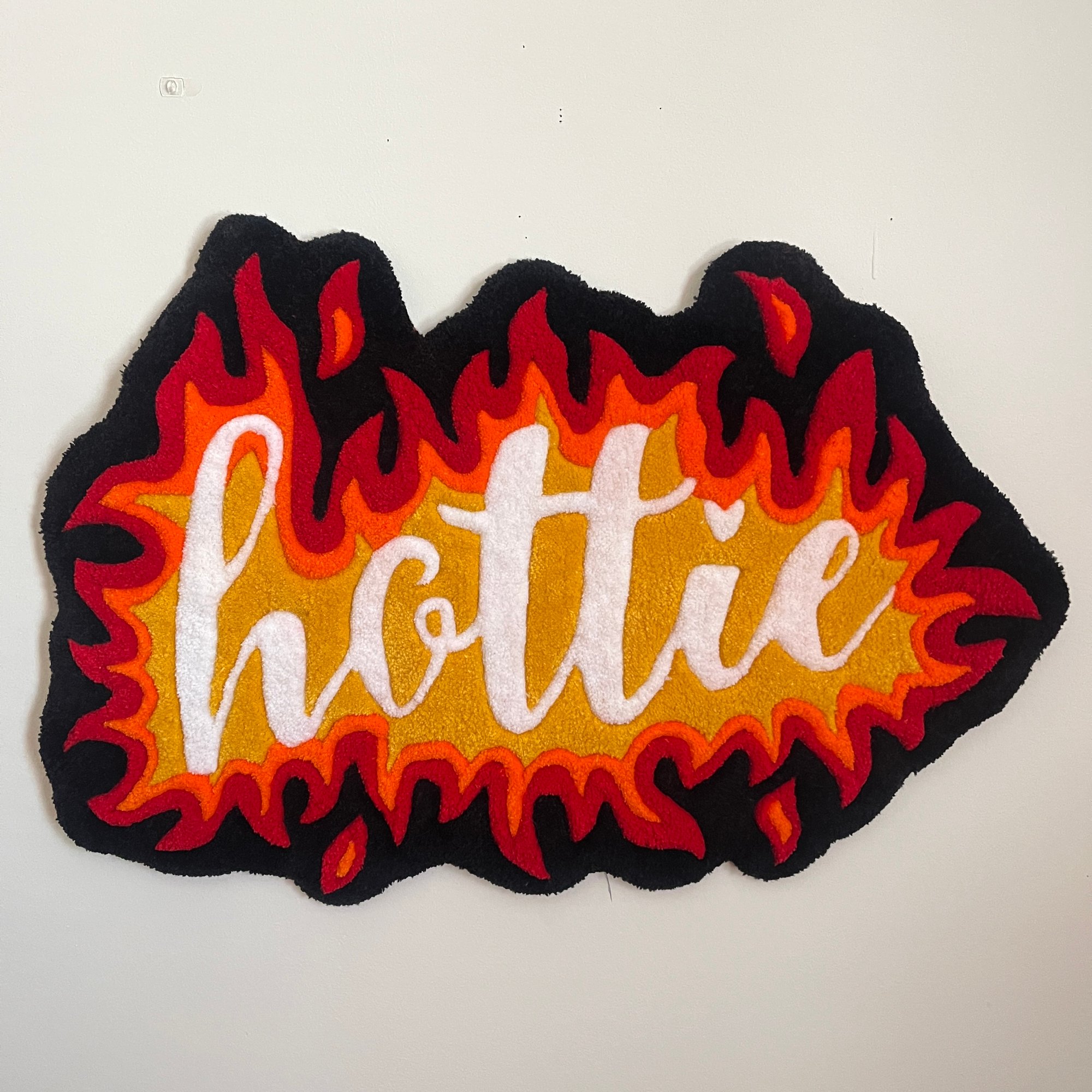 -Cursive "hottie" surrounded by 3 toned flames & a black outline